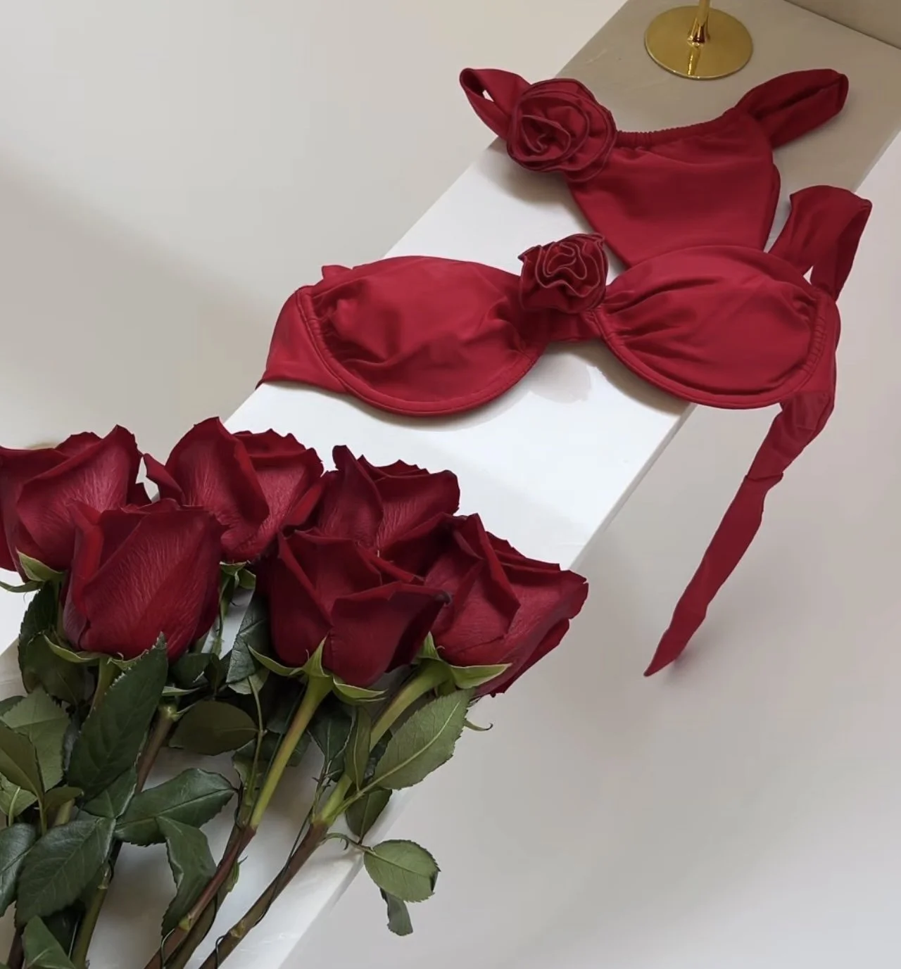 A red bra with attached straps and a red flower detail, a bunch of red roses, and a gold-colored stand on a white surface.