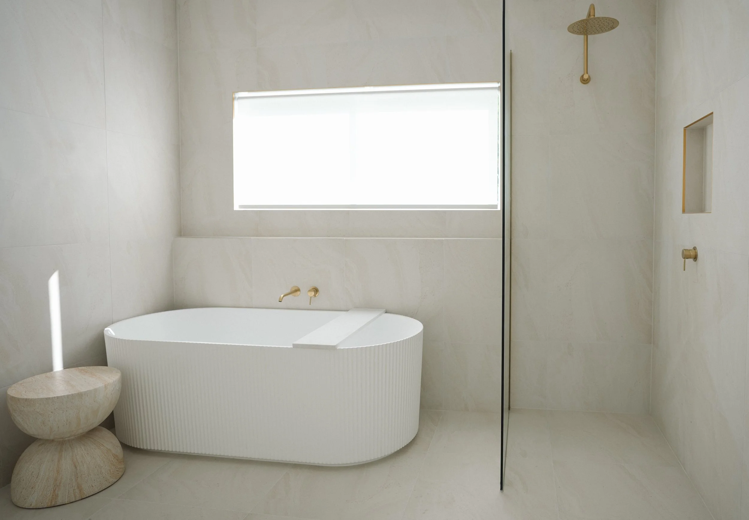 Modern bathroom with a white freestanding bathtub, gold fixtures, a stone side table, a window above the tub, a shower area with a rain showerhead, and minimalist decor.